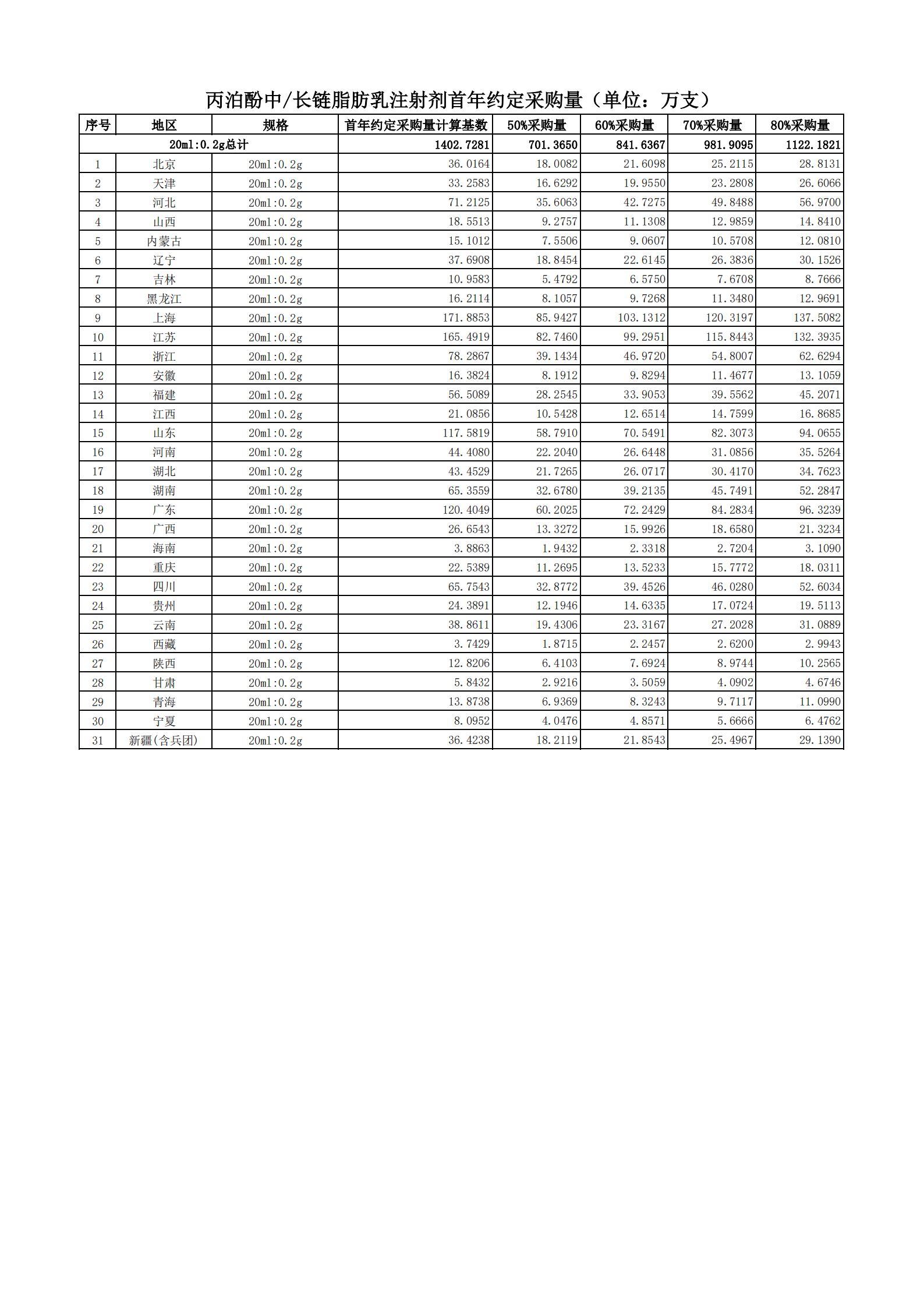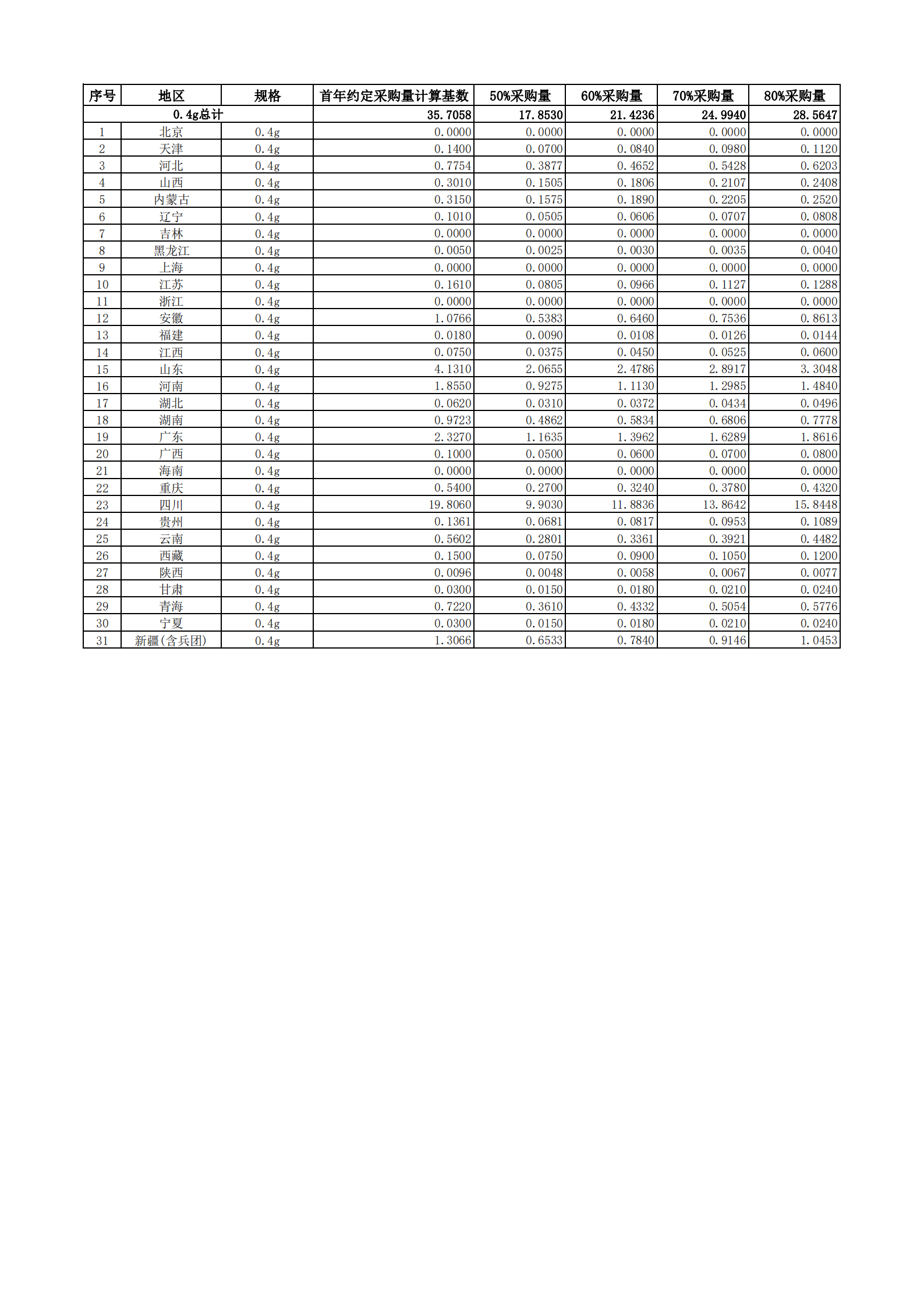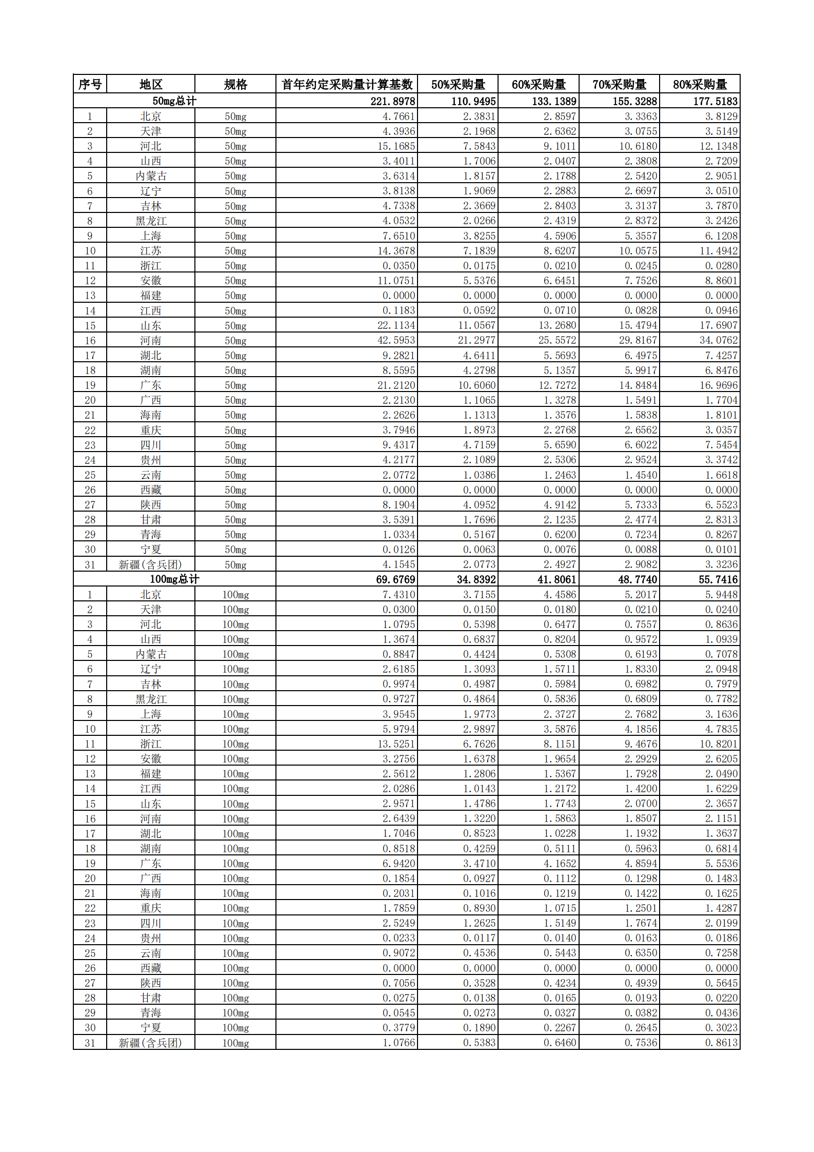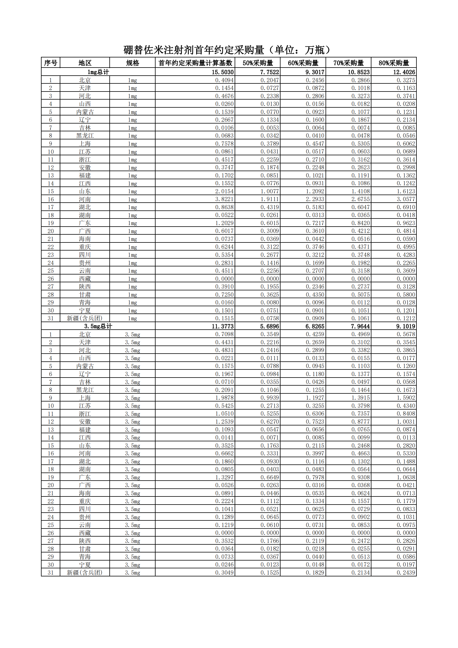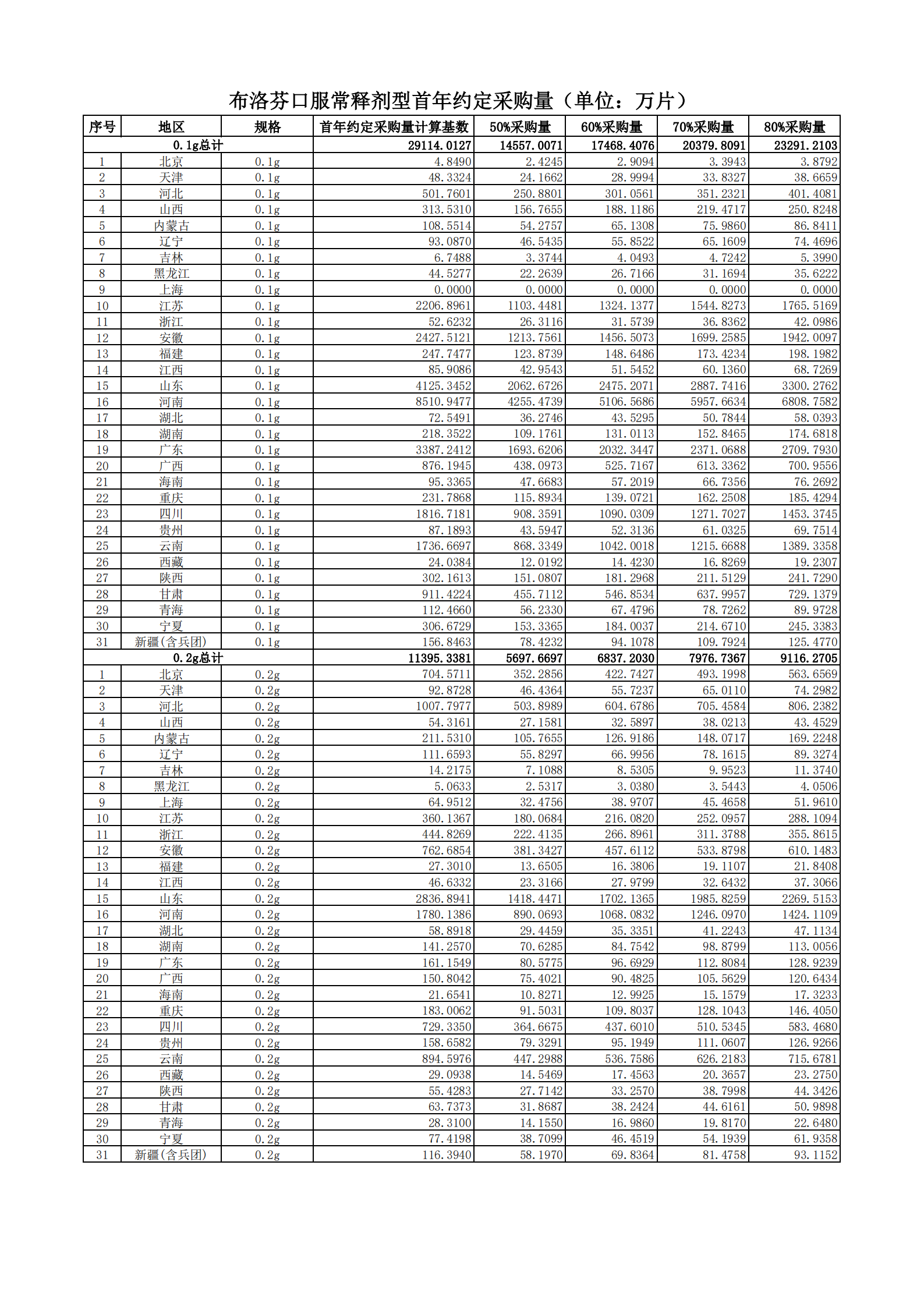 附表2 各地首年約定采購量