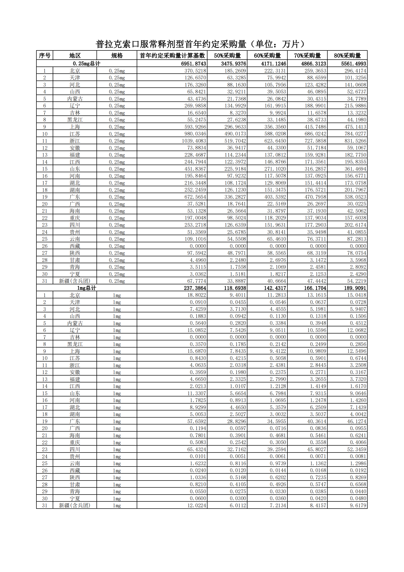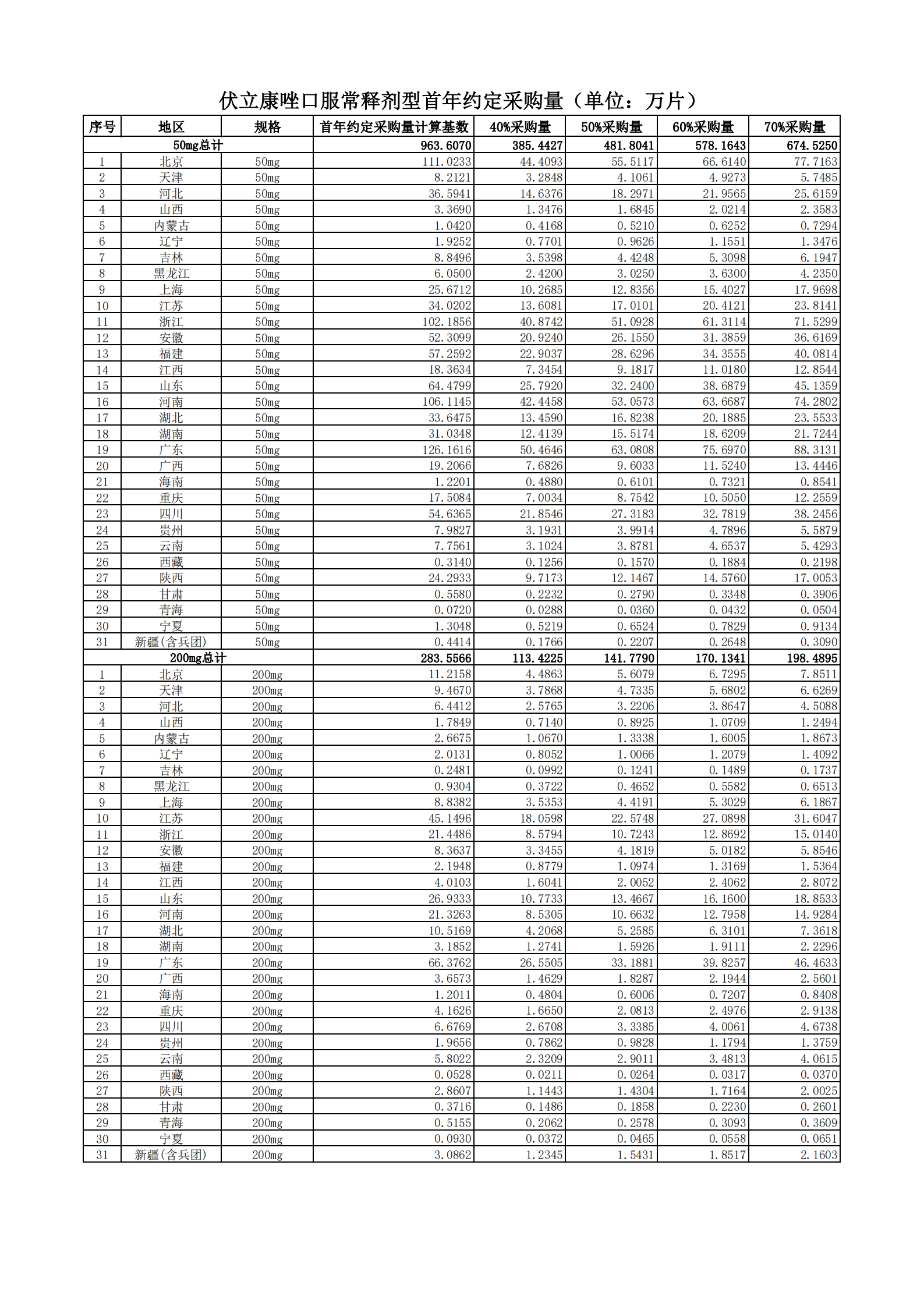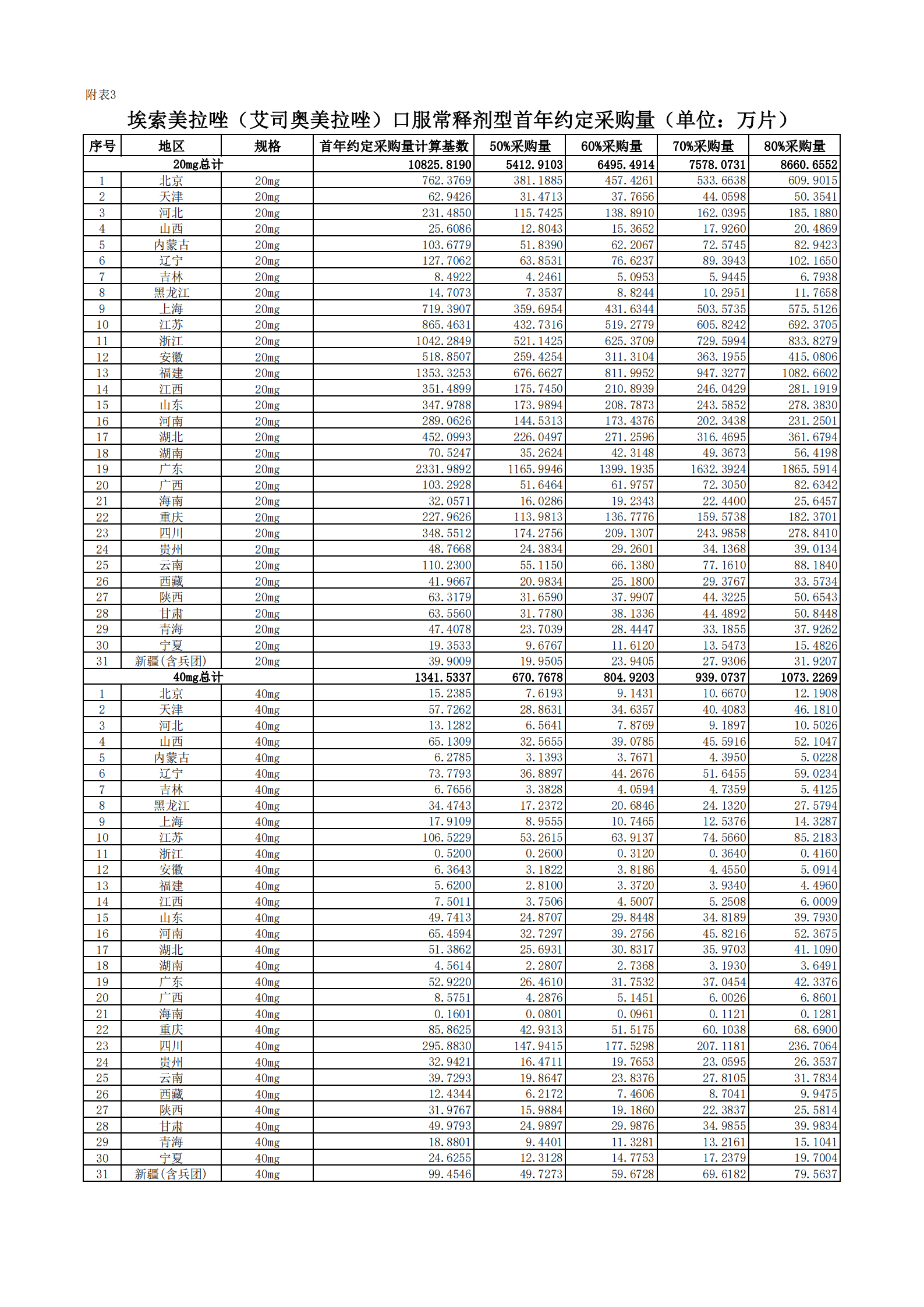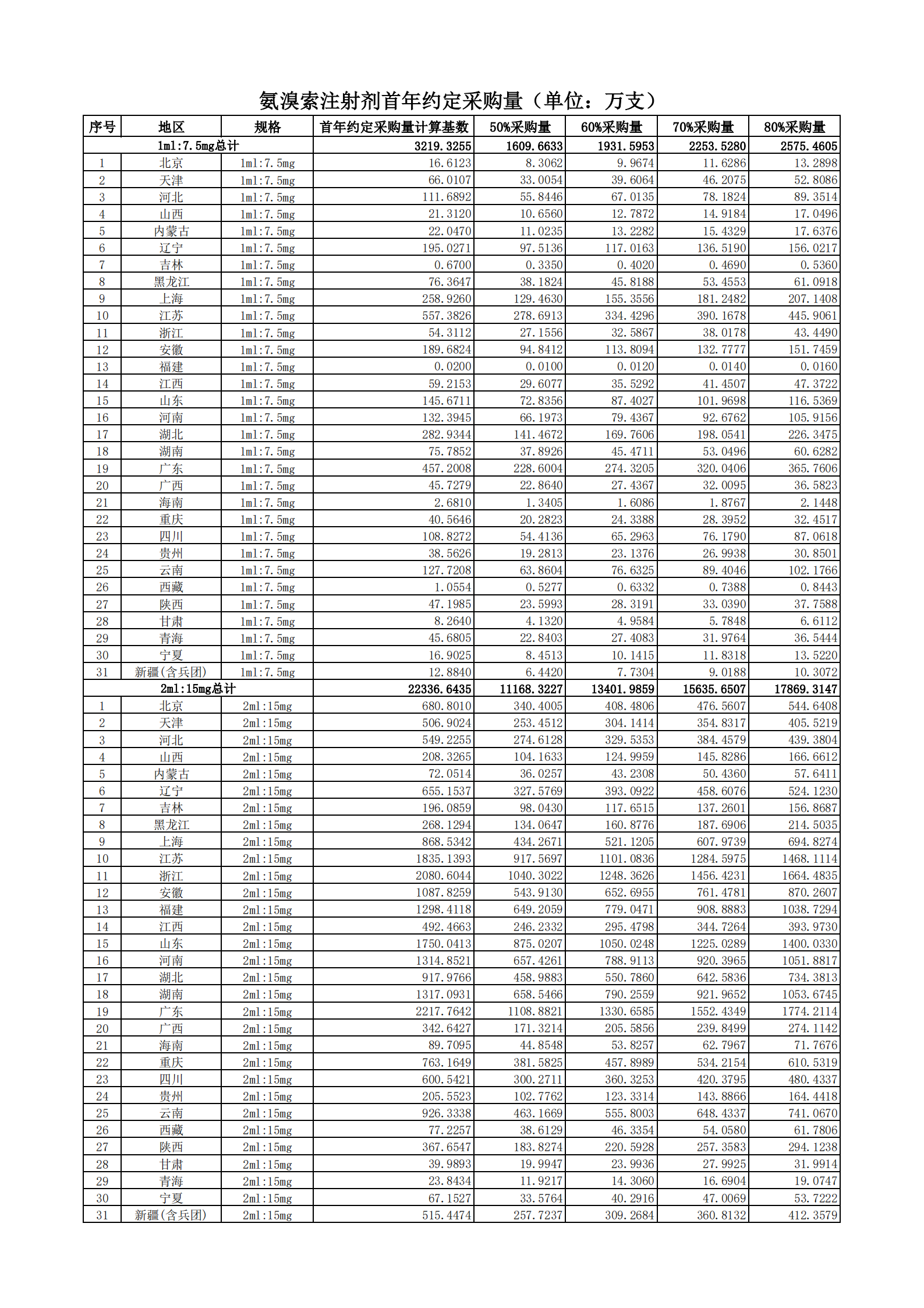 附表2 各地首年約定采購量
