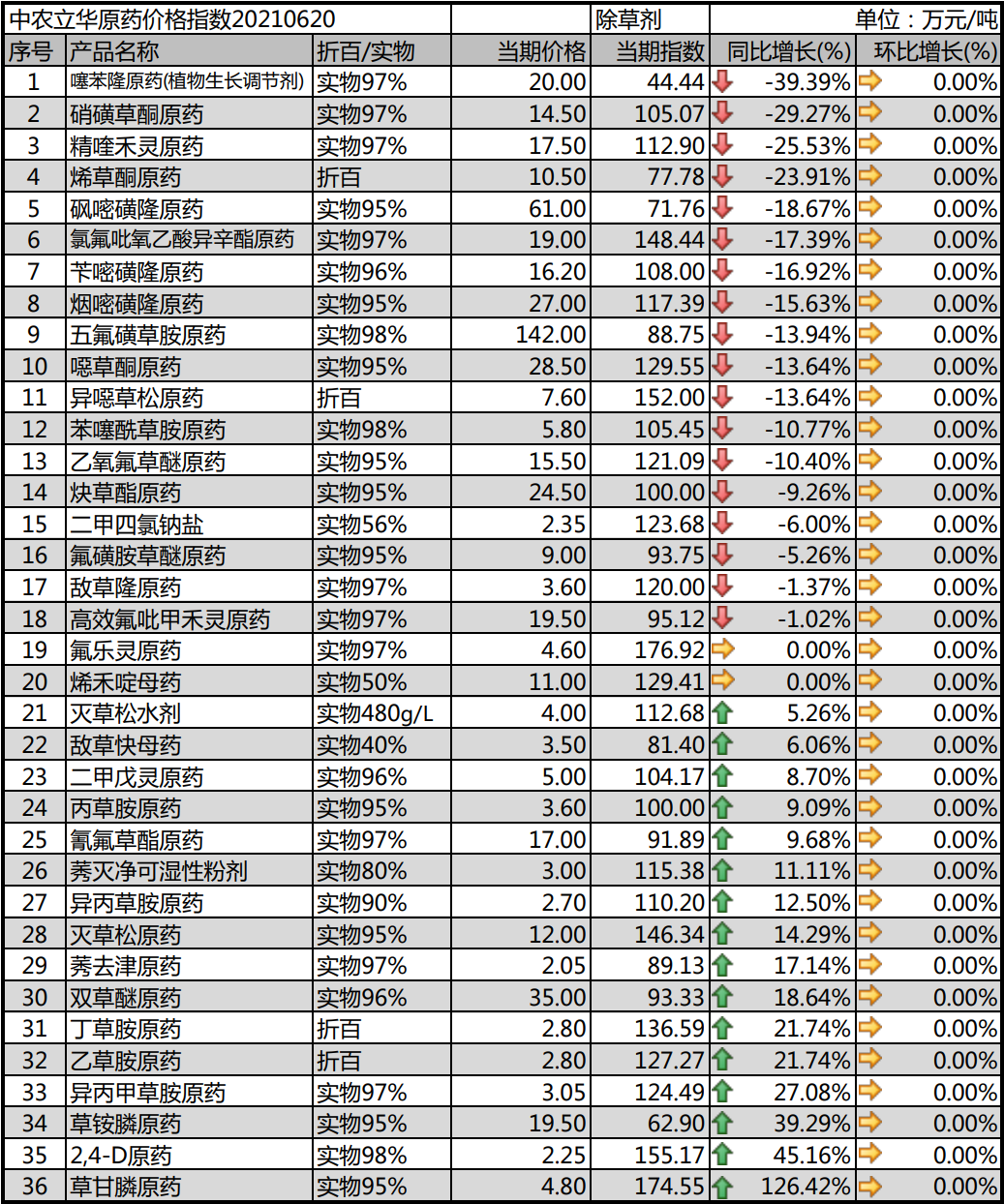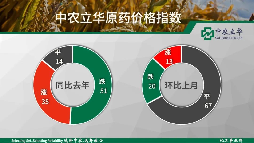 上漲:草甘膦原藥、丁草胺原藥、乙草胺原藥、2,4-D原藥、二甲戊靈原藥、草銨膦原藥、氰氟草酯原藥、丙草胺原藥、異丙草胺原藥、異丙甲草胺原藥、莠滅凈可濕性粉劑、莠去津原藥、滅草松原藥、雙草醚原藥等 //04//殺蟲劑