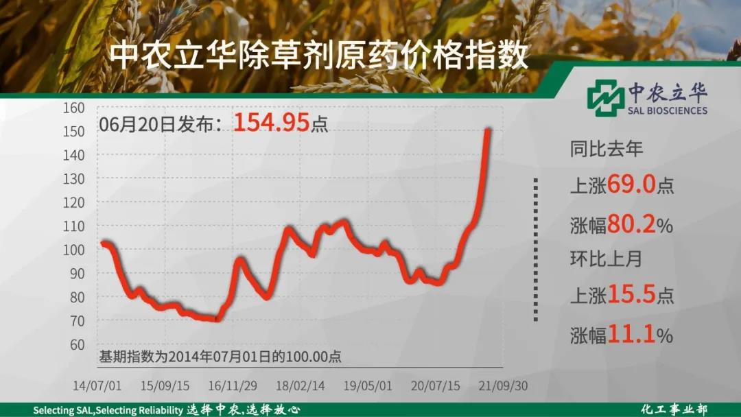 除草劑進入傳統(tǒng)用藥淡季,需求開始回落,但滅生性除草劑均大幅上漲。2021年06月20日中農(nóng)立華除草劑原藥價格指數(shù)報154.95點,其中草甘膦原藥繼續(xù)暴漲,創(chuàng)出近十年歷史新高。