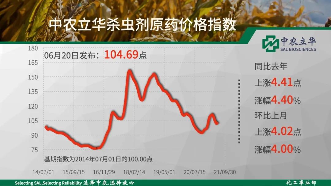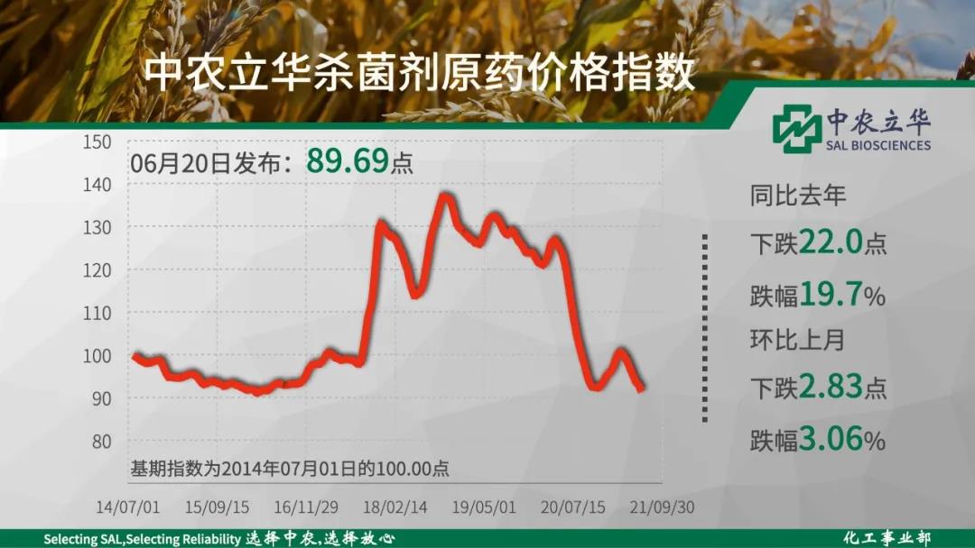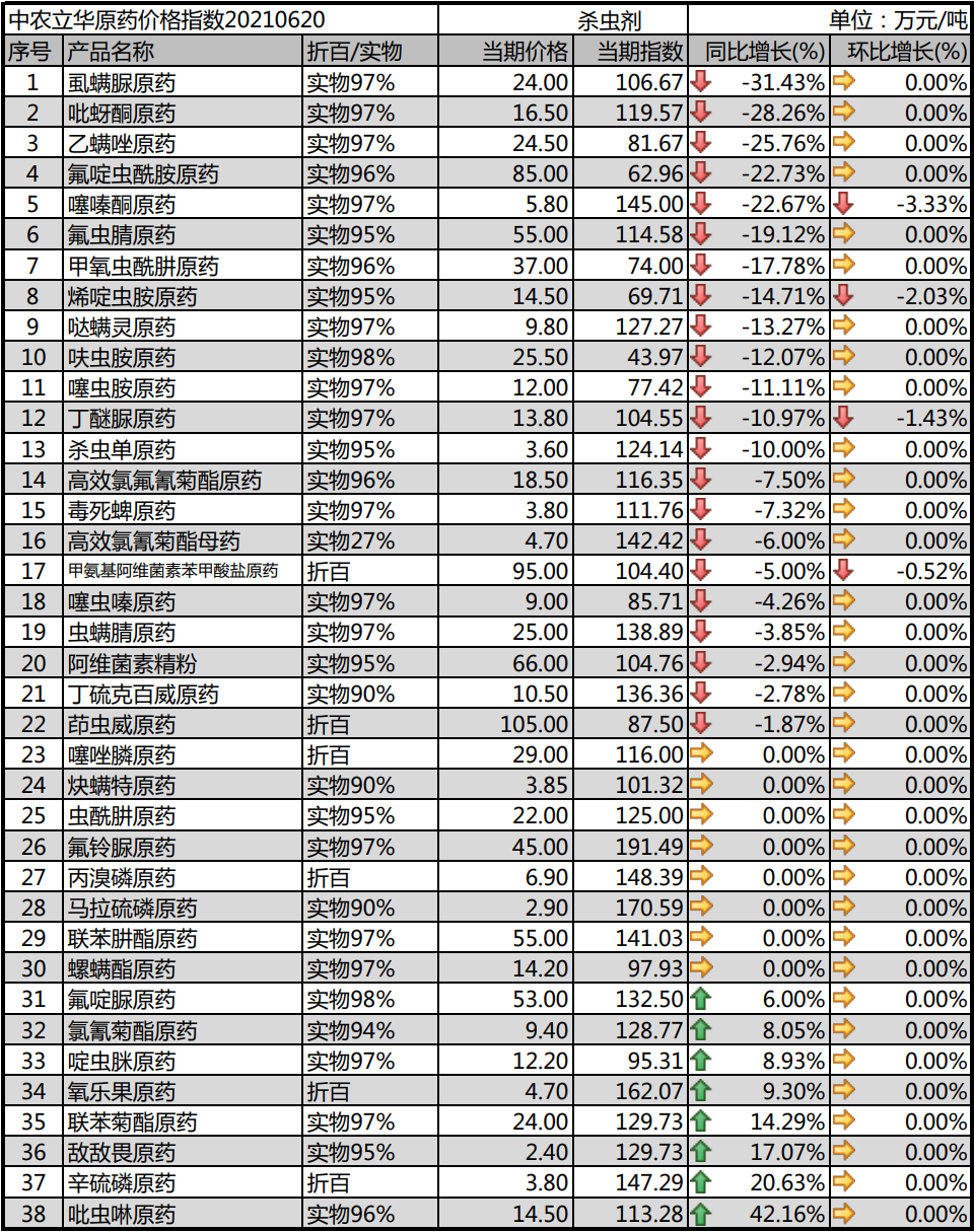 2021年06月20日中農(nóng)立華殺蟲劑原藥價格指數(shù)報104.69點,環(huán)比上月大幅上漲4.00%。上漲:氯氰菊酯原藥、聯(lián)苯菊酯原藥、敵敵畏原藥、氧樂果原藥、吡蟲啉原藥、氟啶脲原藥、辛硫磷原藥、啶蟲脒原藥等持平:噻唑膦原藥、炔螨特原藥、蟲酰肼原藥、氟鈴脲原藥、丙溴磷原藥、馬拉硫磷原藥、聯(lián)苯肼酯原藥、螺螨酯原藥等下跌:噻嗪酮原藥、烯啶蟲胺原藥、丁醚脲原藥、甲氨基阿維菌素苯甲酸鹽原藥等 //05//殺菌劑和中間體
