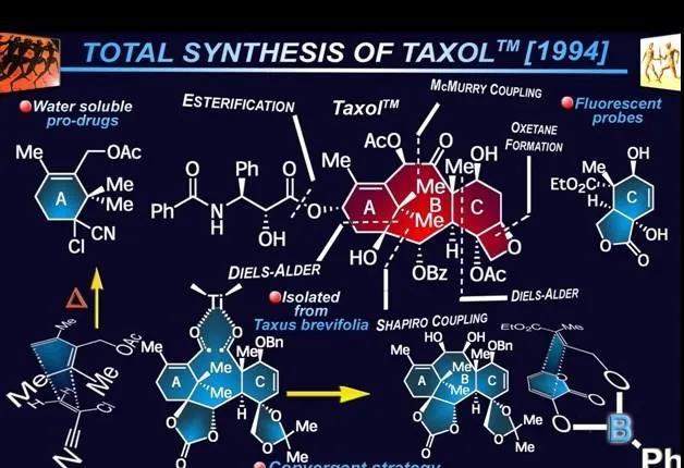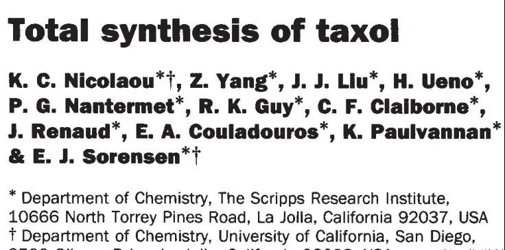 先后共有30多個研究組參與研究,化學家們投入大量人力和財力進行了幾十萬次實驗,實屬罕見。而Nicolaou教授指導下紫杉醇合成的成功,在有機化學和抗腫瘤藥物研發(fā)領(lǐng)域意義非凡。1994年2月17日,Nature雜志首先報道了taxol的全合成。