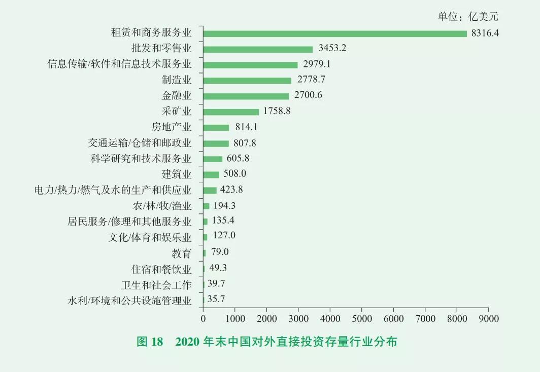 數據還顯示,2020年末,中國對外直接投資覆蓋了國民經濟所有行業類別,存量規模上千億美元的行業有六個。