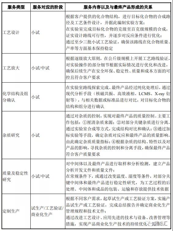 第一、CDMO 服務是最終商品形成的業務過程。公司為客戶提供的 CDMO 服務的主要目標是按照客戶要求成功研發出具備商業化生產可行性的醫藥中間體或原料藥等產品。CDMO 服務是最終產品得以形成的過程。公司提供的各項 服務內容及其與最終產品形成的關系如下: