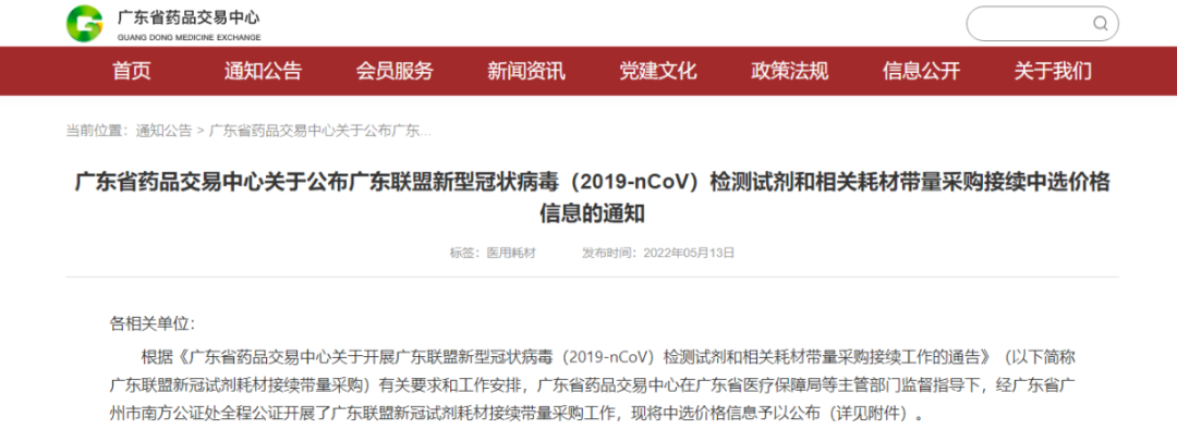 5月13日,廣東省發(fā)布新冠檢測試劑、耗材等相關產品聯(lián)盟帶量采購接續(xù)工作的通知。本次中選結果:普通核酸最低報價3.2元,抗原自測最低報價3.91元。
