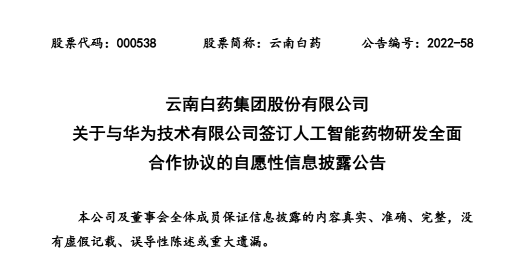7月25日,云南白藥公告稱,與華為達成全面合作,雙方將在人工智能藥物研發(fā)領域開展交流與合作,探索聯合科研創(chuàng)新機制,包括但不限于大小分子設計、相關病癥、數據庫開發(fā)等。