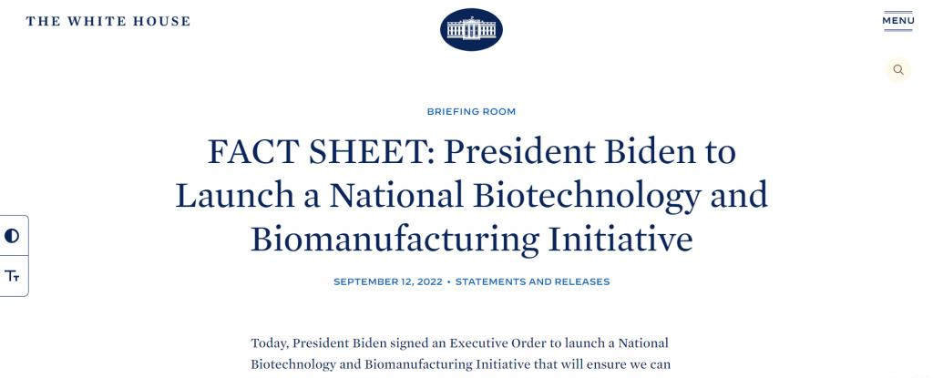 9月12日,白宮官網發布簡報,宣布美國總統已簽署了一項鼓勵美國生物技術生產和研究的行政命令。