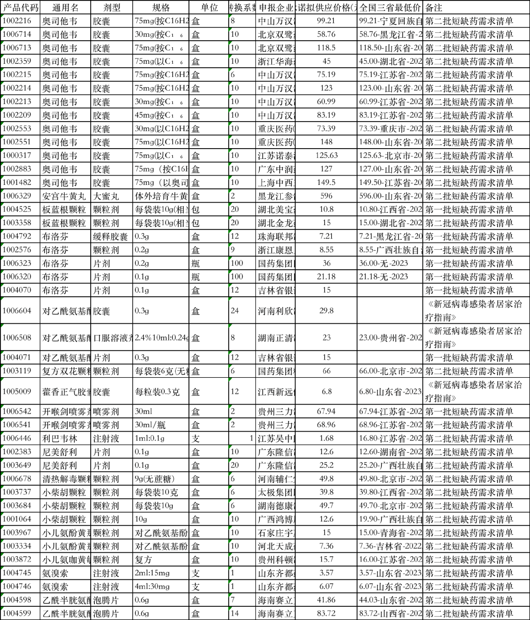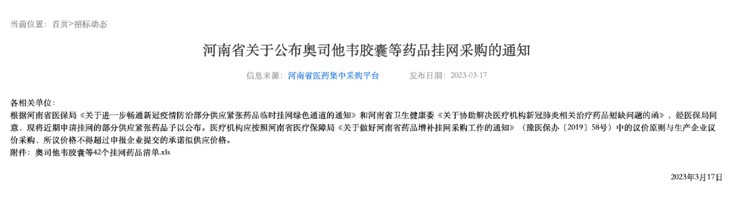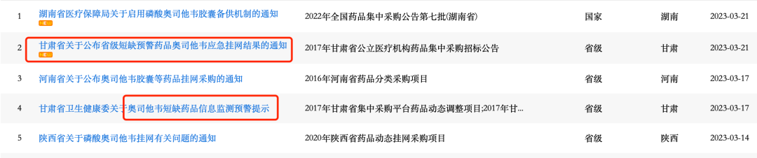3月21日,甘肅省發(fā)布《關(guān)于公布省級短缺預(yù)警藥品奧司他韋應(yīng)急掛網(wǎng)結(jié)果的通知》;同一天,湖南省醫(yī)保局發(fā)布《關(guān)于啟用磷酸奧司他韋膠囊備供機制的通知》;前幾日,河南、甘肅也陸續(xù)發(fā)布相關(guān)文件。
