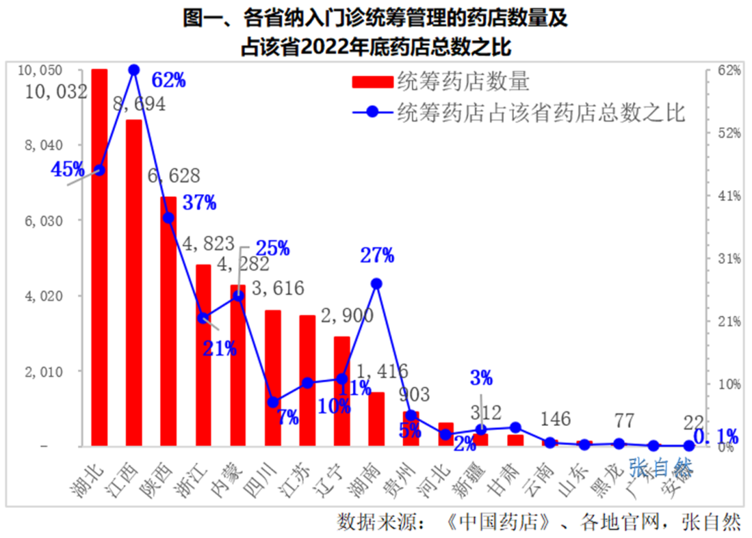• 納入門診統籌管理的藥店數量占本省藥店總數比例最高的是江西,占比62%,也是目前占比唯一過半的省份。