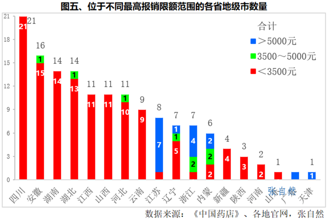 • 起付線<200元的占了1/3,涉及5省的46個地級市,即四川(21個市)、河北(10個市)、云南(9個市)等;