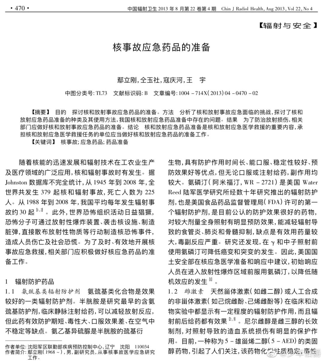 第①種,氨磷汀(阿米福汀,WR-2721)是美國Water Reed陸軍醫學研究所經數十年研究推出的輻射防護劑,也是美國食品藥品監督管理局(FDA)許可的第一個輻射防護劑,是目前公認的防護效果很好的藥物, 對較大劑量全身照射有明顯預防效果,能減輕輻射導致的食管炎、肺炎和骨髓抑制。