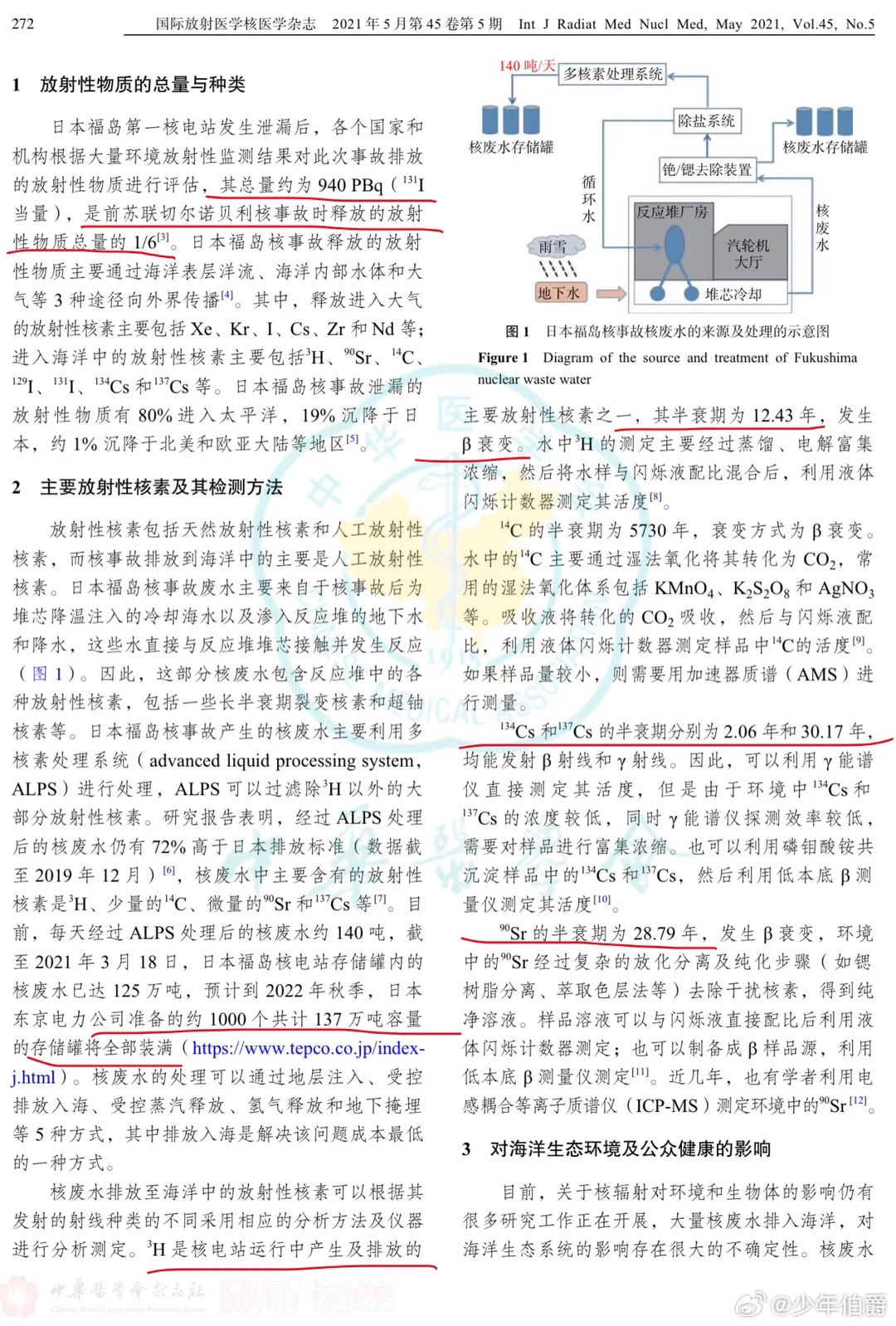 日本福島核事故產生的核廢水主要利用多核素處理系統(advanced liquid processing system,ALPS)進行處理,ALPS可以過濾除3H以外的大部分放射性核素。研究報告表明,經過ALPS處理后的核廢水仍有72%高于日本排放標準(數據截至2019年12月),核廢水中主要含有的放射性核素是3H、少量的1?C、微量的??Sr和13?Cs。