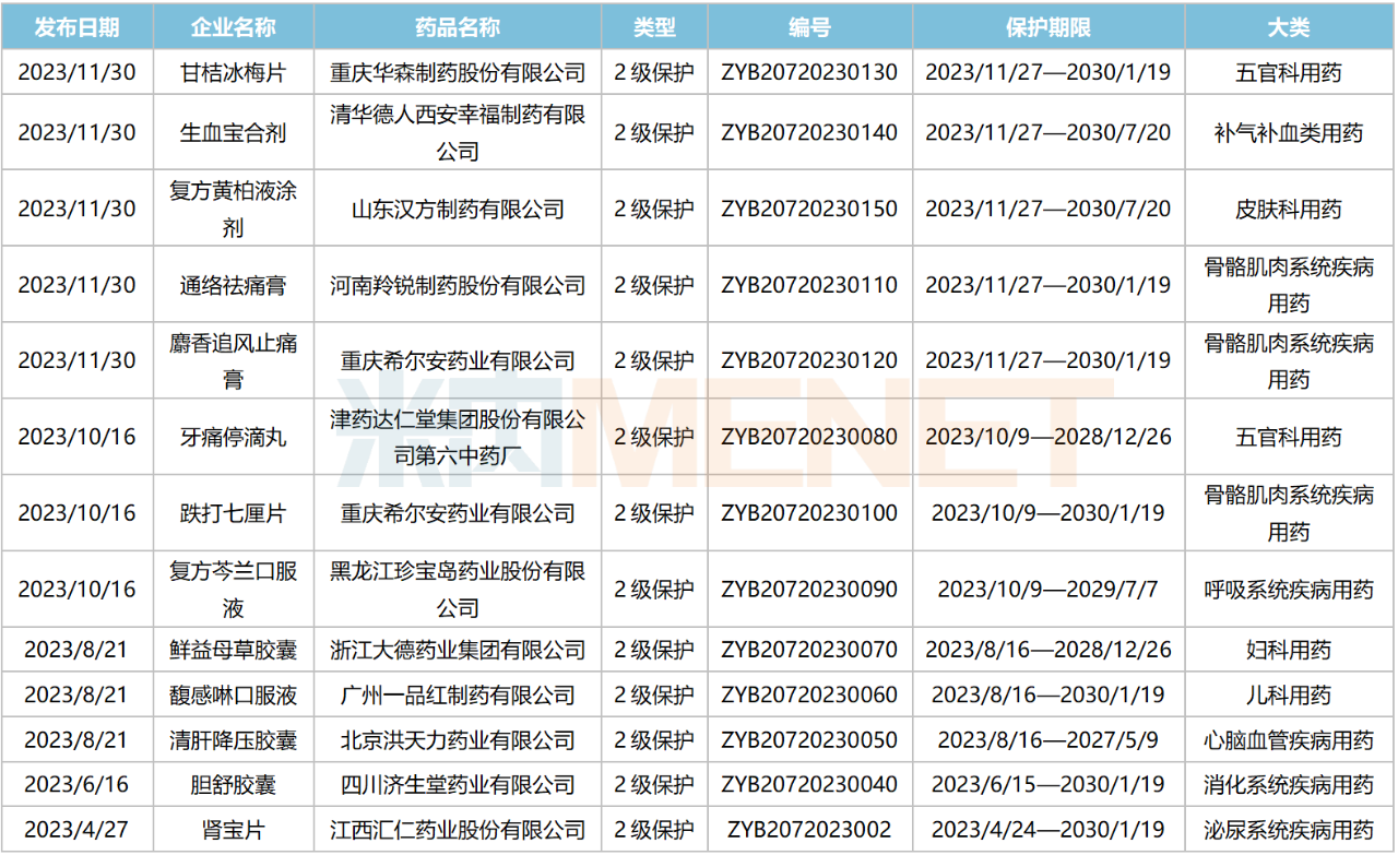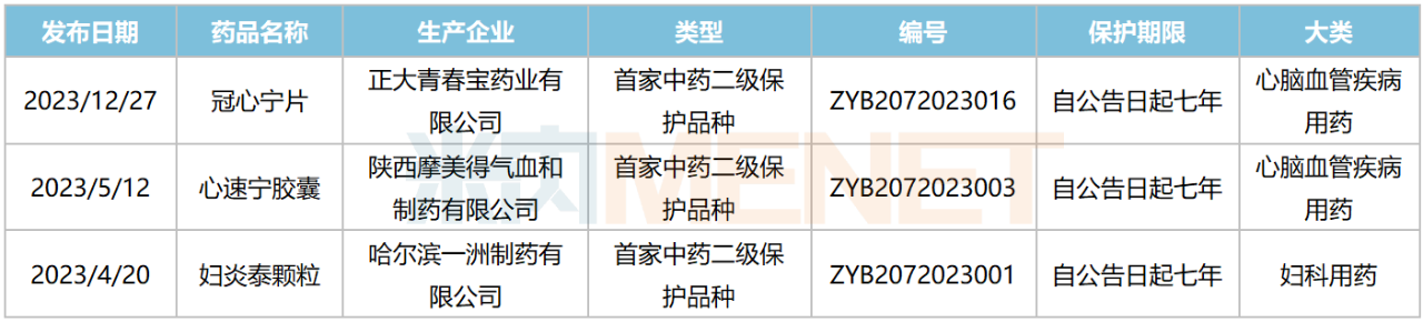2023年國家藥監局共發布了3個獲批首家中藥二級保護品種的公告,涉及正大青春寶藥業的冠心寧片、陜西摩美得氣血和制藥的心速寧膠囊、哈爾濱一洲制藥的婦炎泰顆粒3個獨家品種(含獨家劑型,下同),涵蓋心腦血管疾病用藥、婦科用藥2個治療大類。