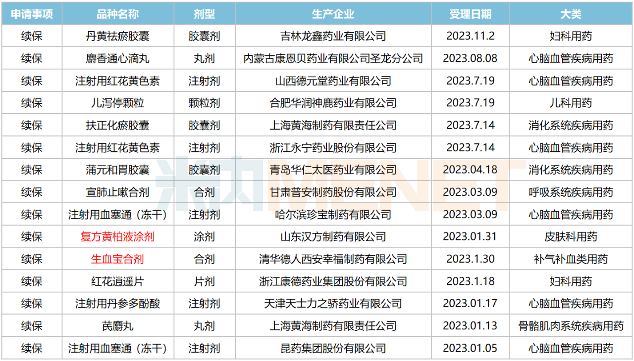 申請續保且暫未獲批的13個中成藥2022年在中國三大終端六大市場的銷售額合計超過60億元,其中有9個銷售額超過1億元,珍寶島的注射用血塞通(凍干)以超23億元領跑,昆藥集團的注射用血塞通(凍干)超14億元,浙江永寧藥業的注射用紅花黃色素、天津天士力之驕藥業的注射用丹參多酚酸均超4億元。