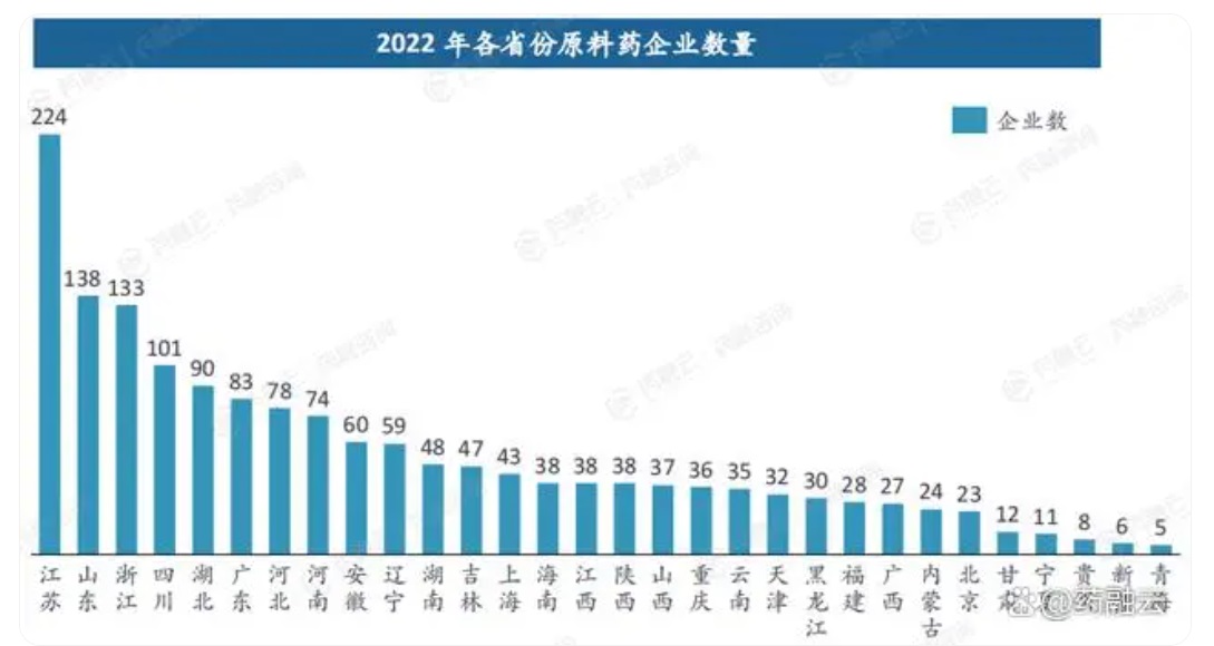 其中,企業數>100家的有4省,分別為江蘇(224家)、山東(138家)、浙江(133家)、四川(101家),4省合計占全國原料藥企業總數的近四成(37%)。